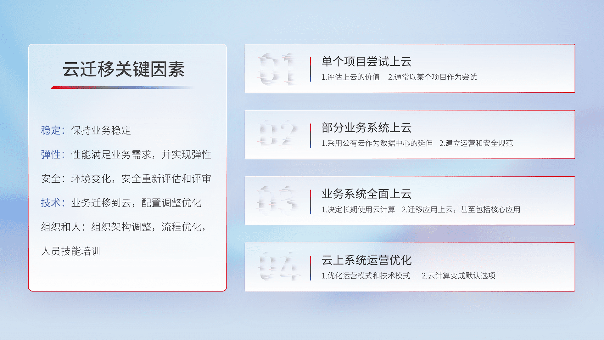 结合实际业务,,,从规划设计、、云平台选型、、云原生改造、、、、数据迁移、、、集成交付,,迁移全过程为客户识别最佳上云路径,,,,做好风险识别管理,,,,设计网络架构、、、、身份权限、、安全审计合规、、、操作审计、、日志审计、、、监控告警策略、、、、多站点容灾设计等,,,,对云上基础设施进行整体规划,,提升IT治理水平,,,,以满足弹性、、高可用、、高性能的需求。。