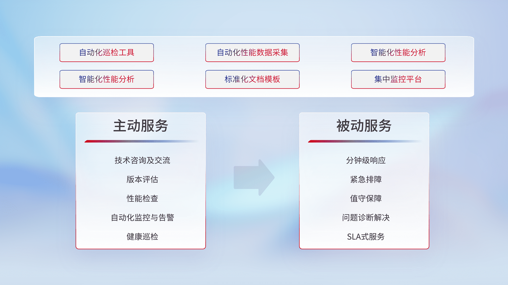 智能化工具和标准化文档,,,,保障服务质量,,提供主动服务(包含技术咨询、、、版本评估、、、、性能检查、、、自动化监控与告警、、健康巡检)和被动服务包含(分钟级响应、、、紧急排障、、、、值守保障、、问题诊断解决、、、SLA服务)。。。。