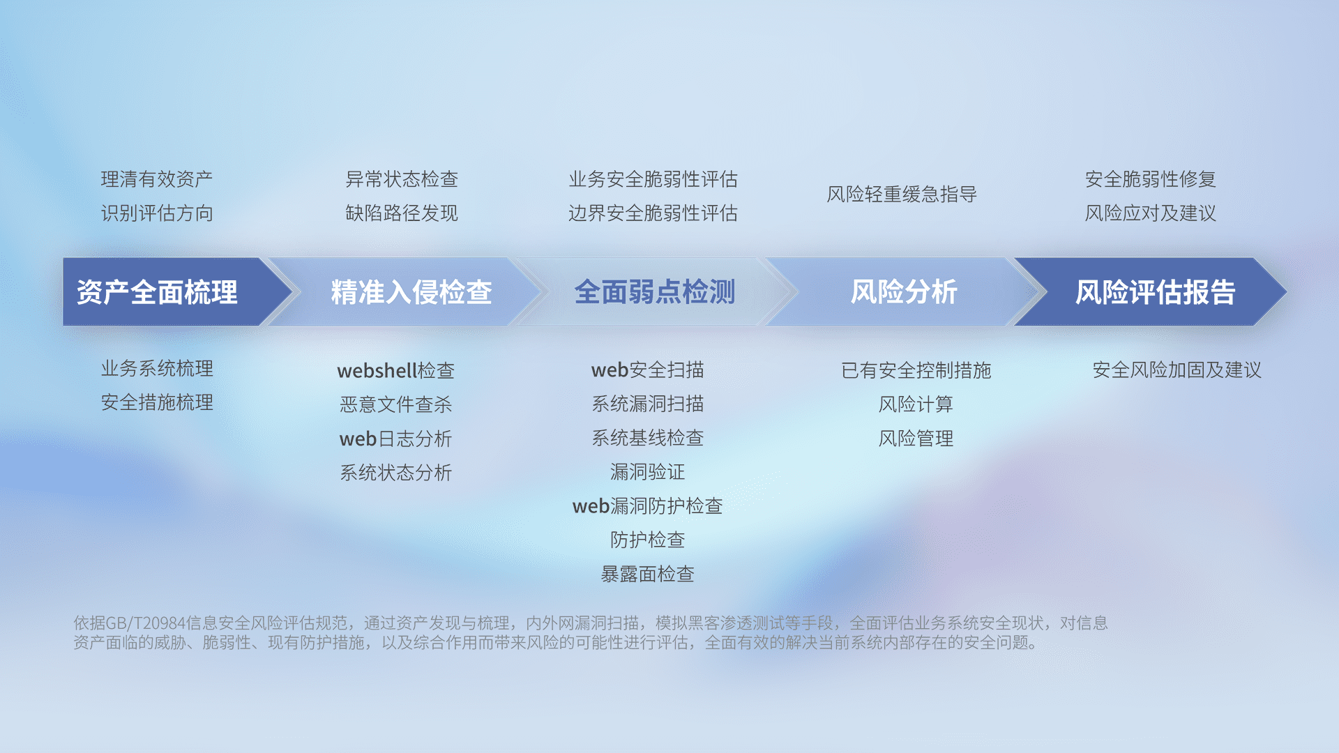 针对客户行业特性,,,以专业的安全服务+多厂商联合解决方案提供专属的一站式安全管理服务,,,,帮助客户全面感知网络空间威胁,,基于识别、、、、检测、、、、分析、、防护、、、监测、、、响应的服务理论模型,,,,从方案咨询、、、、集成交付、、评估验证、、、、优化加固、、、运维运营,,,,致力于为客户提供完整的闭环管理式安全服务。。。以实战经验为客户打造高抵御风险的安全体系,,帮助客户发现威胁、、对抗威胁、、、、处置威胁,,,不断积累安全对抗能力,,持续保障数字化安全。。。